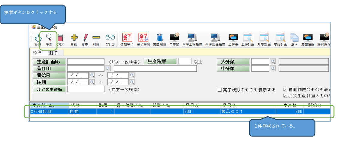 まずは、作成された生産計画を見ていきます。メニュー「生産管理」-「生産計画一覧」から自動作成された生産計画を見つけることができます。生産計画一覧が起動したら、「検索」ボタンをクリックします。