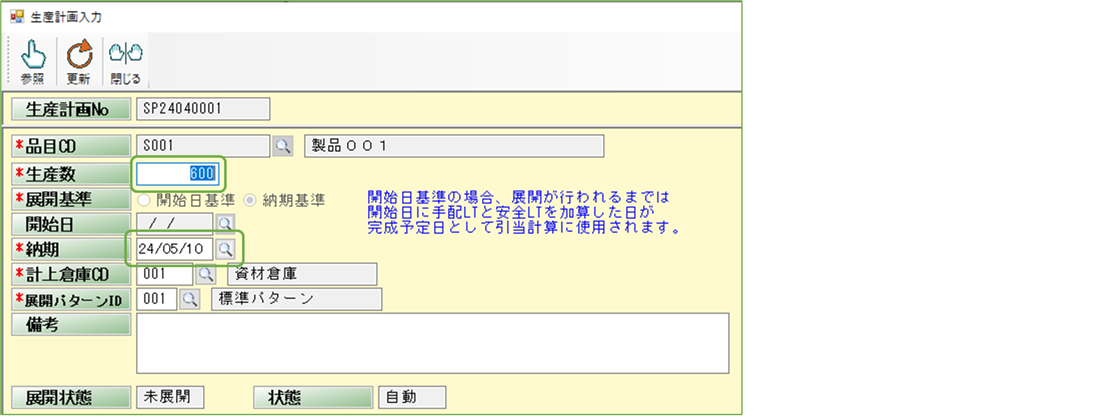 行を選択した状態で「変更」ボタンをクリックするか、行をダブルクリックすると、生産計画データの詳細が見ることができます。