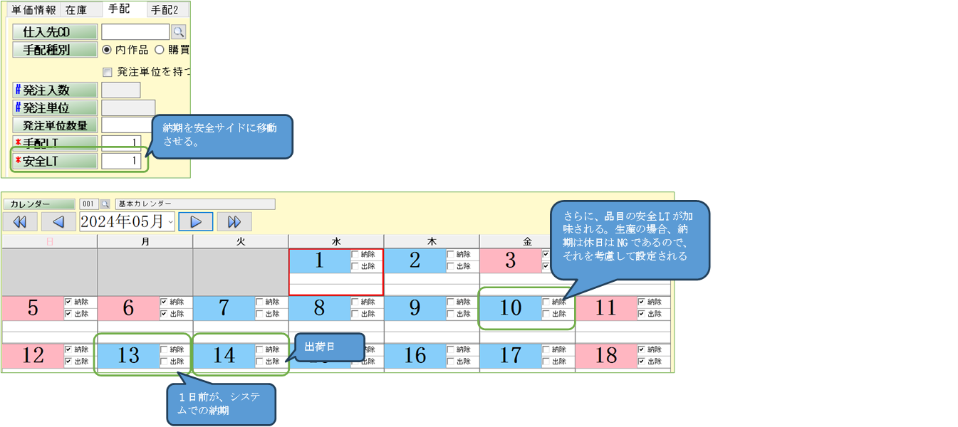 まず。受注の出荷予定日が5/14日でした。このシステムでは必要日は、1日前の5/13日となります。さらに品目マスタにより安全リードタイムが1となっていますので5/12日を生産計画の納期にしようとしますが、カレンダー設定上5/11, 12日が休日設定になっているので5/10日が納期となります。