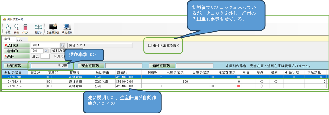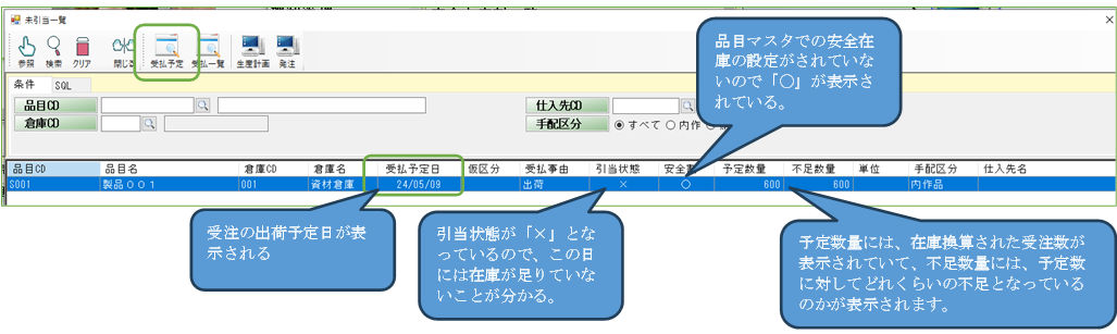 未引当一覧は、不足となっている時点の情報なので、どういった経緯により不足になったのかを知りたい場合は、上部メニューの「受払予定」をクリックすると現在庫からの予定の一覧が表示され、どのような経緯で不足になるのかが分かります。