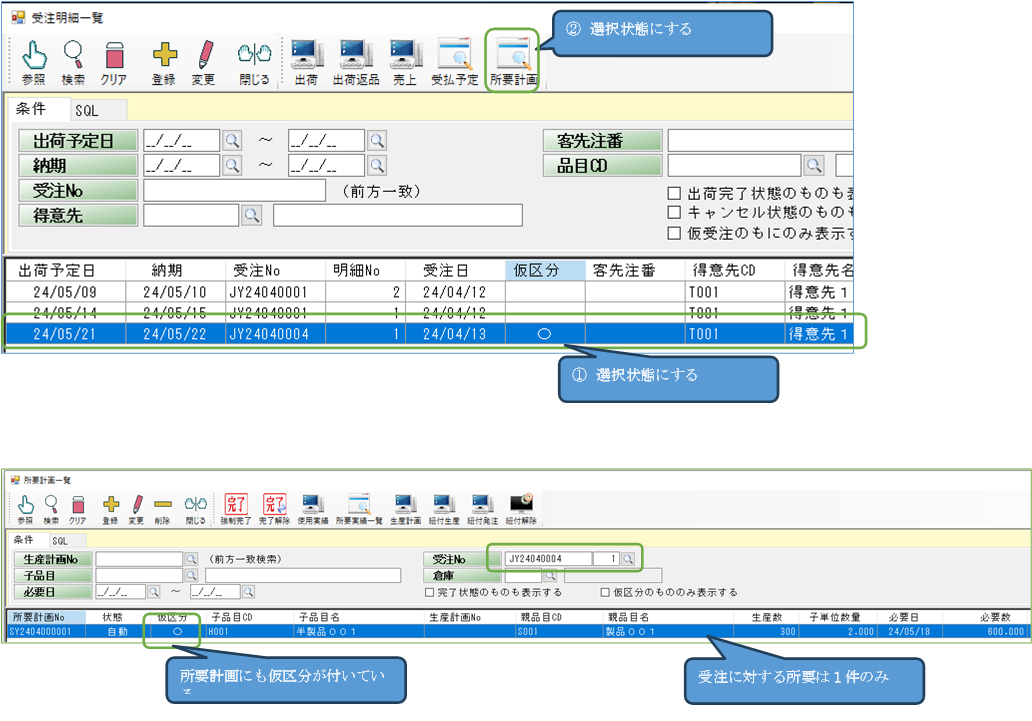 上記の受注を確定してどうなるのかを見ていきます。まず所要計画一覧を確認してみます。所要計画一覧は生産計画を展開した後に作成されるデータです。受注明細一覧を起動します。「受注管理」-「受注明細一覧」より起動します。起動したらそのまま「検索」ボタンをクリックします。そうすると、先ほど登録した、仮受注の列に「〇」のはいった受注が表示されます。その行を選択し(行をクリックして、その行が反転状態になる)、上のメニューの「所要計画」をクリックします。選択した受注の仮所要計画が表示されます。