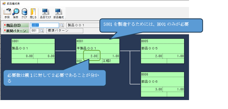 確認すると、受注に対する仮の所要計画が1件作成されています。部品構成を確認するとS001の部品構成にH001があるので1件の所要計画ができたことが分かります。