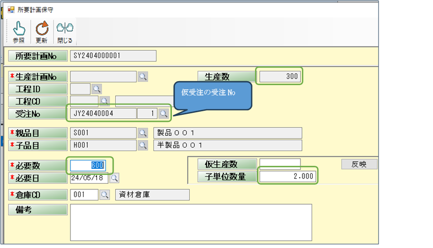 作成された所要計画を見ていきます。所要計画一覧の行をダブルクリックすると、所要計画保守が立ち上がります。最初に受注Noに仮受注の受注Noが入っていることが確認できます。過ぎに子品目として[H001]が入っていることが確認できます。数量ですが次のようにして算出されます。