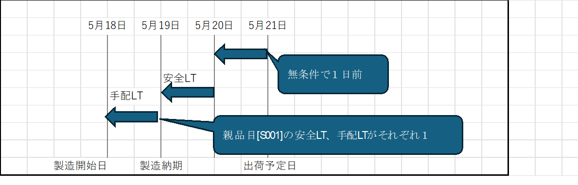 次に必要日の算出方法ですが、まず受注の出荷予定日の5/21が基準となります。そこから無条件に1日前には親品目の製造が終わっておく必要があるので無条件に-1日となり5/20日が親品目の仮の完成日となり、そこから親品目の安全LTの1日がはたらくので納期は5/19日となります。そこから本来ならば、納期展開し製造開始日を求めるのですが、仮所要展開では、工程展開をすることなく、簡易的に親品目の手配LTによって算出します。手配LTは1日であるので製造開始日は5/18となります。あくまでも仮展開なので本当の展開とは計算方法が異なりますがある程度の目安にはなります。