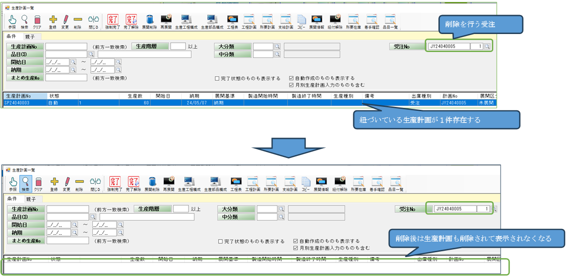 上記例の受注は、紐付手配で生産計画が自動作成されていました。生産計画が着手状態でない限り生産計画も削除されます。