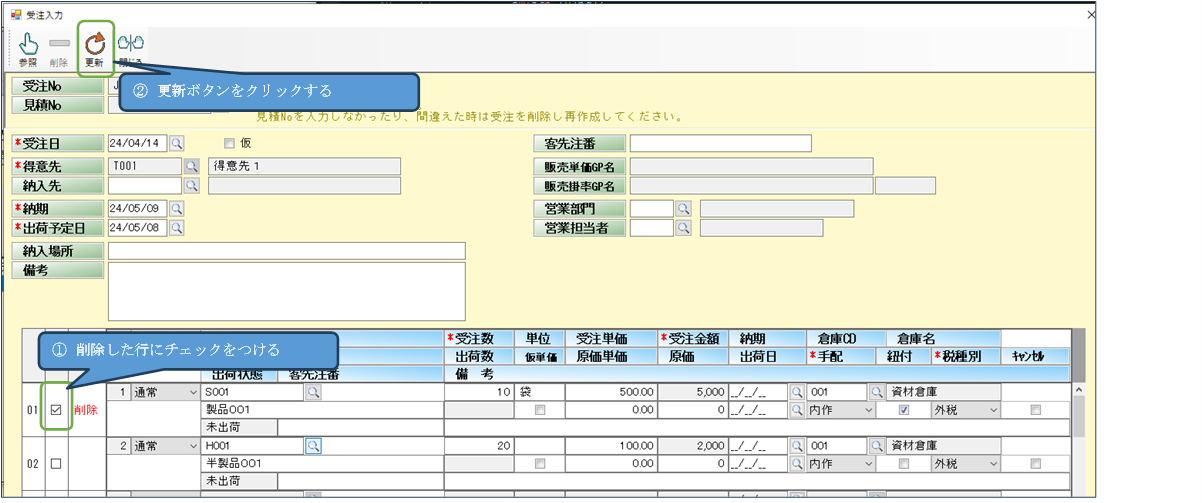 伝票すべてではなく、明細単位で削除した場合は、受注入力からもしくは受注明細一覧から削除します。