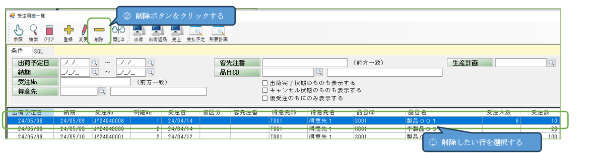 次に受注明細一覧からの削除ですが、メニュー「受注管理」-「受注明細一覧」より受注明細一覧を起動します。受注明細一覧が起動したら、削除対象を選択して上部メニューの「削除」をクリックします。削除は1件ずつしかできません。