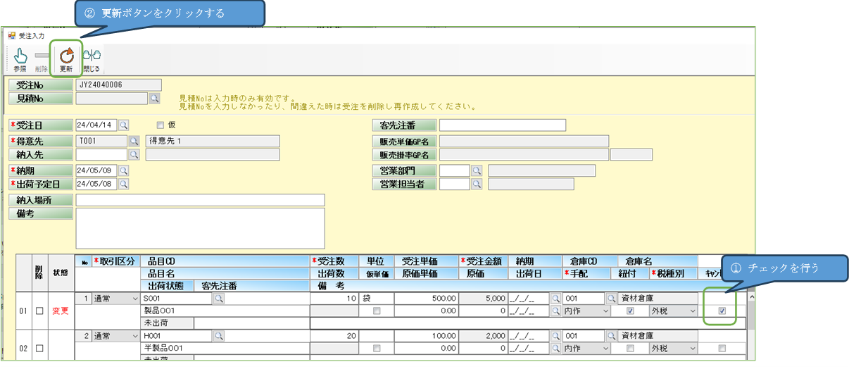 削除条件を上記で書きましたが、受注の削除が出来ないものの処理の受注のキャンセルを説明していきます。受注のキャンセルは、受注入力から行います。該当する受注入力を変更モードにて起動します。受注明細の右端にキャンセルのチェックボックスがありますので、チェックを行い、更新ボタンをクリックします。キャンセルに状態になった受注は、出荷や売上を行うことが出来なくなりますし、受払予定からも削除されます。