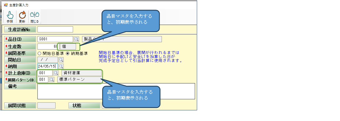 展開基準は、製造開始日を指定するかもしくは製造納期のどちらを指定するかを選択します。「開始日基準」を選択すると開始日が入力できるようになり、「納期基準」を選択すると納期が入力できるようになります。納期を入力し、更新ボタンをクリックするとデータが確定されます。
