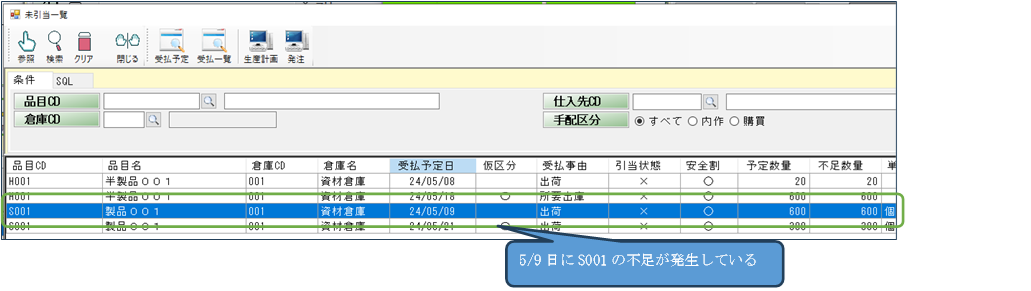 例を見ていきます。下記の未引当一覧には品目[S001]が倉庫[001]で5/9日に600個足りていないという不足が発生しています。これを解消するためには5/9日以前に何らかの手段で倉庫[001]の在庫を増やしてあげなければならないということになります。