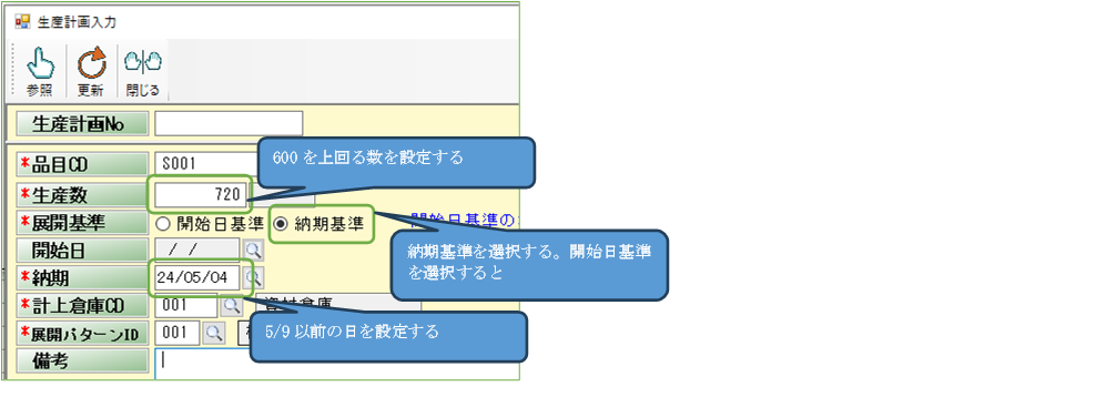 上記の未引当を消すために、生産計画を立てていきます。生産計画では品目[S001]、計上倉庫[001]に5/9日以前に600個以上の生産計画を立てる必要があります。この時に展開基準は「納期基準」を選択することが大事です。開始日基準を選択してしまうと、生産計画を入力しただけではいつが納期(完成計上予定の日)なのか分からないからです。入力が終わったら、更新ボタンをクリックします。