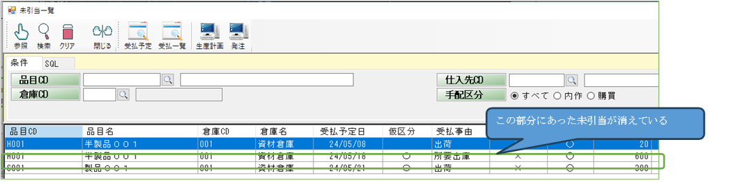 生産計画の登録が終わったら、もう一度、未引当一覧を起動してみます。そうすると先ほどまであった未引当の行が消えています。
