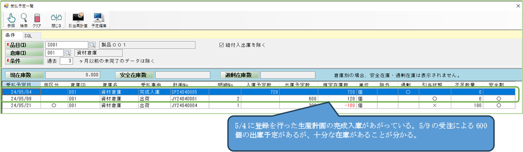 メニュー「在庫管理」-「受払予定一覧」をクリックし、受払予定一覧を起動します。品目に[S001]、倉庫に[001]を入力して検索ボタンをクリックします。そうすると現在から未来にかけての在庫の推移が表示されます。5/9の受注の前に生産計画が入り、5/9の受注の在庫が確保されていることが分かります。