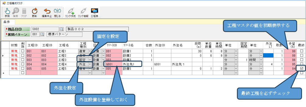 注意すべきところは、工程3の工程種別を「固定」に工程4を「外注」にすること、後は最終工程に必ずチェックを入れることです。工程4は外注設備を入力する必要が出てきますので、予め外注設備を登録しておく必要があります(外注先を直接入力できない)。外注設備の登録は設備マスタの解説を見てください。すべて入力し終わったら、「更新」ボタンをクリックします。