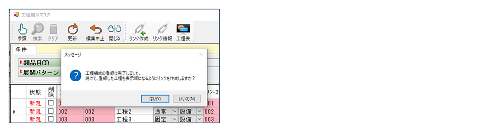 「登録した工程を表示順になるようにリンクを作成しますか?」と聞いてきます。これは、入力した順に工程が行われるように自動的に設定するかということです。「はい」をクリックすれば工程1から順に作業をおこなうようになります。「いいえ」を選択すると、上記メニューの「リンク情報」をクリックして、手動で工程間の関係を入力する必要が出てきます。リンク情報を説明する前に、ヘッダー部にある展開パターンについて説明していきます。