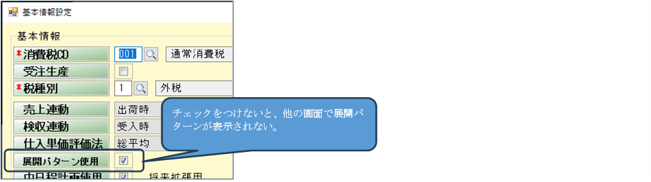 展開パターンは、ユーザによって使用する・しないが分かれるので、使用するためには、メニュー「システム」-「基本情報設定」で基本情報設定を起動し、「展開パターン使用」にチェックを付ける必要があります。