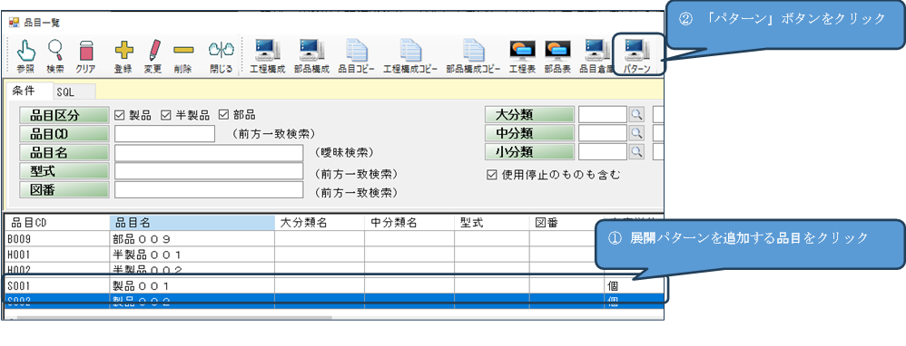 次は、展開パターン名の登録です。パターン名は、メニューから展開パターンマスタを起動し、入力することもできますが、ここでは品目一覧からの登録を説明します。展開パターンを増やしたい品目を選択状態にして、上部メニューの「パターン」をクリックします。そうすると展開パターンマスタが起動します。