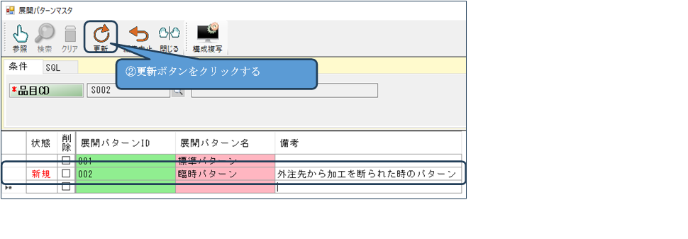 起動すると、既に展開パターンIDが登録されている状態です。この展開パターン[001]はどの品目にも登録されています。追加するには、展開パターンIDと名称を入力し、「更新」ボタンをクリックします。新しい展開パターンができると、新しいパターンでの工程構成・部品構成が作成可能になります。