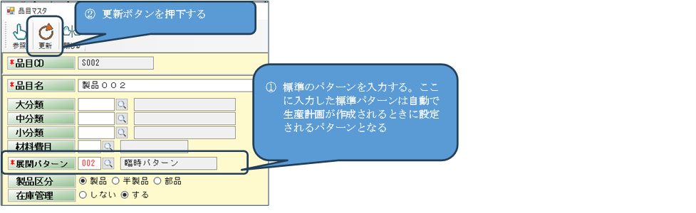品目マスタを起動します。品目マスタのヘッダー部分に、「展開パターン」の項目があります。そこに標準とする展開パターンIDを入力もしくは選択します。その後データを更新すれば設定されます。