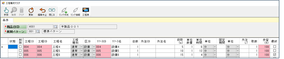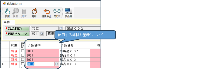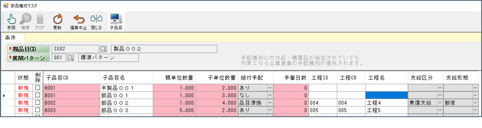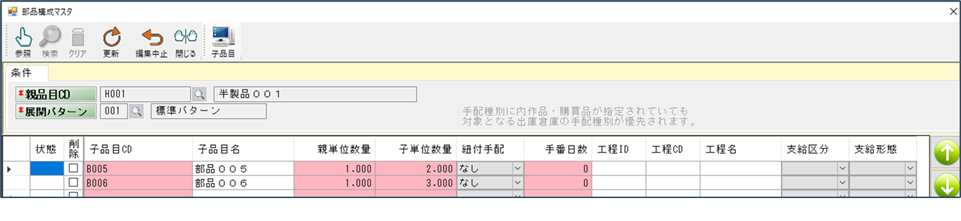 そうすると部品構成マスタが、選択された品目CDとその標準展開パターンが入った状態で起動します(展開パターン使用時)。もちろんメニューから直接「部品構成マスタ」をクリックして起動することもできますが、品目一覧から起動する方が、その後も品目に関するいろいろな操作ができ便利です。