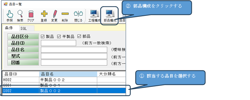 品目一覧から該当の品目を選択し、上部メニューの「部品構成」をクリックします。