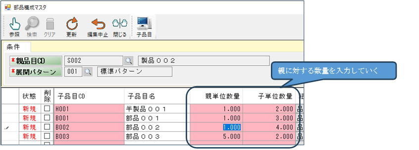 次に、親品目に対する必要数量を入力します。親に対する数量をそのまま書き込んでいきます。入力は次のようになります。
