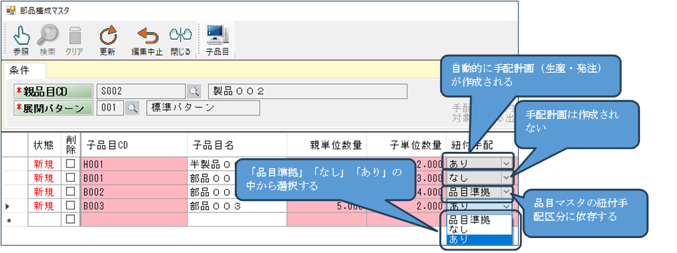 例えば上の図の[H001]は半製品ですが、もし紐付手配を「あり」とすると、在庫がもしあったとしても[H001]の生産計画が、自動的に作成されます。[B001]の場合は自動的に購買品なので、仮発注が作成されることとなります。「品目準拠」の場合は、品目マスタの紐付区分を参照します。「紐付手配」の場合は、「あり」と同じ動きをし、「在庫引当」の場合は「なし」と同じ動きを取ります。