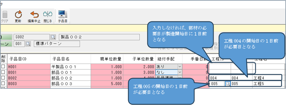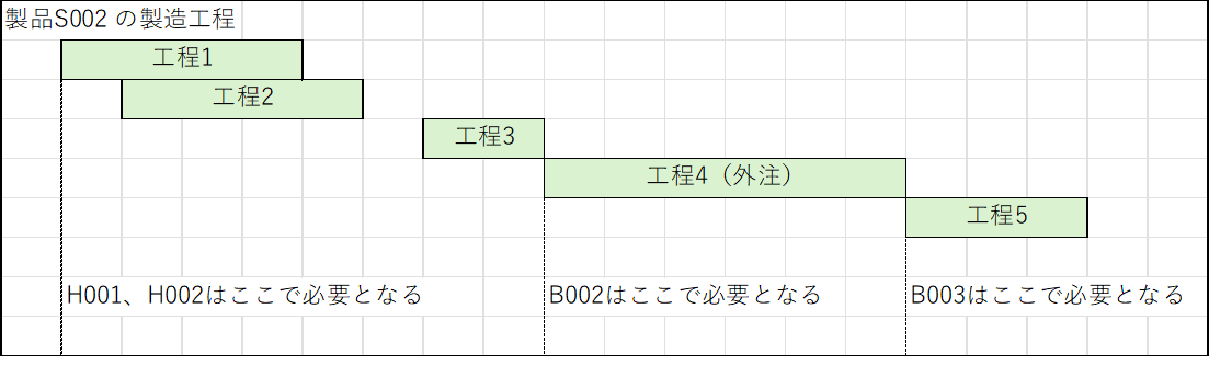 次は工程IDの項目ですが、これは部材がどの工程で必要かを入力します。工程IDを入力しなければ、その部材は製造開始と同時に必要ということになります。工程IDを入力すれば、その工程の開始日に必要ということになります。よって入力は次のようになります。