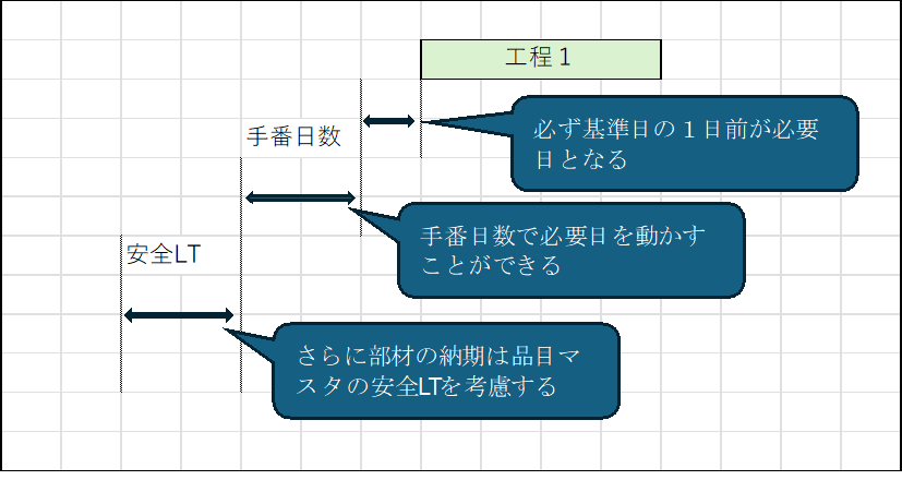 例えばH001の手番日数を5と入力すれば、製造開始日の5日前が必要日ということになります。これを踏まえて必要日及び納期の算出方法をここで書いておきます。