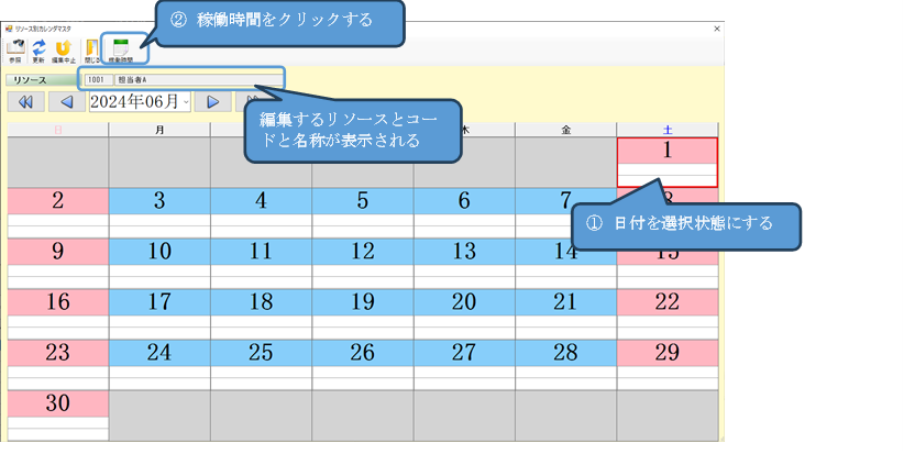 リソース別カレンダマスタの編集方法は、カレンダマスタと同じです。カレンダマスタを参照してください。この画面から、稼働日・休日に切り替えを行うことができます。また日付を選択し、サブメニューの「稼働時間」をクリックすることにより、日毎の稼働時間を編集することができます。設備を点検する場合や、担当者が半日休む場合などに活用することができます。リソース別稼働時間の編集方法は稼働時間マスタと同じです。稼働時間マスタを参照してください。