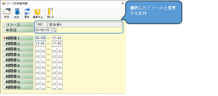 選択したリソースの稼働日や稼働時間を変更することができます。設備や担当者マスタにてカレンダや稼働時間を登録しましたが、あくまでも、基本となるカレンダや稼働時間であって、設備や担当者毎に微妙に違っている場合があります。その場合、ここから変更することによって、そのリソースのオリジナルな稼働日や稼働時間を持つことができるようになります。