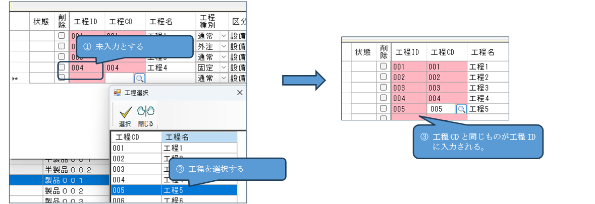 工程構成の重複しない任意のIDを入力します。品目の中で1つの工程コードが複数存在しない場合は、工程CDをそのまま工程IDとしても良いでしょう。その場合、工程IDを未入力にして先に工程コードを入力すると工程コードと同じコードが工程IDに入ります。