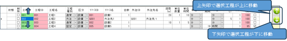選択されている工程を上下の行に移動させます。上下に移動することにより、工程の順序が決まってきます。工程構成を変更状態で起動した場合、必ずサブメニューの「リンク作成」をクリックしてください。「リンク作成」を行うことにより初めて工程の順序が確定されます。(上から下に流れるような工程の場合のみ、複雑な工程を組みたい方は「リンク情報」をクリックし、工程の流れをカスタマイズしてください。)