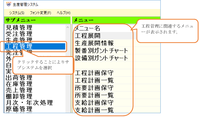 指定されたサブメニューに関連するメニューが表示されます。ただし、ログインユーザーにより表示されるメニューが他のログインユーザーと異なる可能性があります。メニューをダブルクリックすることにより、メニューに連動する画面が起動します。