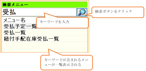 メニューの数はかなり多くどのサブシステムに含まれているのか覚えるだけでも大変です。そこで含まれる文字を指定して検索できるメニューを用意しました。例えば「受払一覧」を起動したい場合、検索部分に「受払」を入力し、右にある虫眼鏡のマークをクリックします。そうすると「受払」を含むメニューが一覧表示されます。「受払一覧」をダブルクリックすることにより画面が起動します。