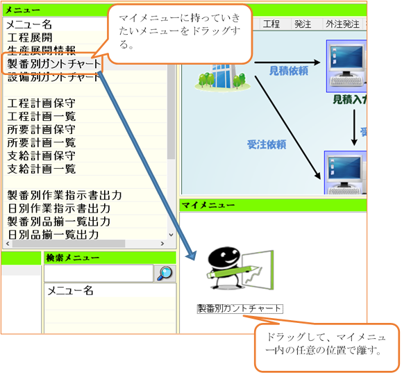 部署によっては頻繁に使用するメニューが違ってくると思われます。よく使用するメニューをマイメニューに持ってくることで、通常業務がやりやすくなります。