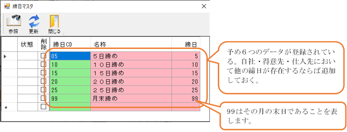 締日マスタは、自社、得意先、仕入先で使用される締日のマスタです。システムでは予め、5日,10日,15日,20日,25日,末日のデータを用意しています。もし、これ以外の日で締日があるならば、登録しておかなければなりません。