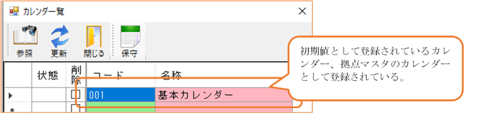 実働日・稼働日、出荷除外日・納入除外日を設定するためのマスタです。初期値では基本カレンダーを1つ持っています。基本カレンダーは土曜日・日曜日を休日にしています。祝日はある程度設定していますが、合っていない部分もあるかもしれませんのできちんと設定してください。また、リソース(設備)毎にカレンダーがある場合は追加を行ってください。