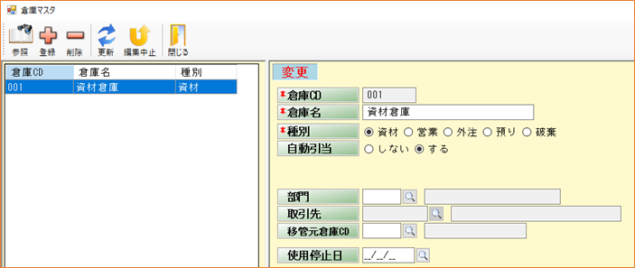 倉庫マスタは、在庫の置き場のマスタです。初期値として資材倉庫を登録しています。名称が合わない場合は倉庫名を変更してください。また倉庫は複数作成することはできますが、たくさん倉庫を分けると、在庫管理が数多くなり、在庫再計算などの処理にかなりの時間がかかるようになります。最小限の倉庫になるようにしてください。
