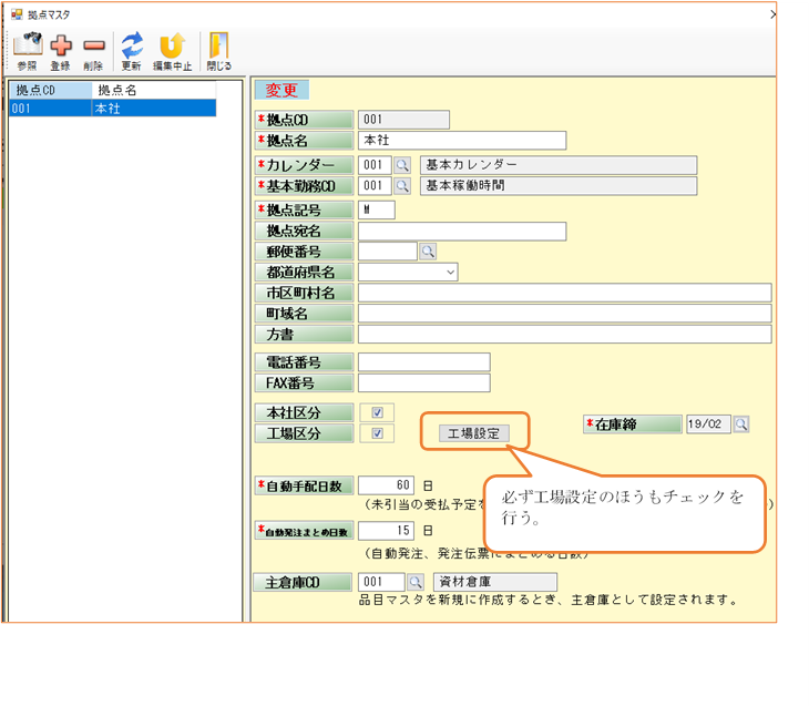 拠点マスタは自社の情報を登録するマスタです。A工場、B工場がある場合は拠点を分けて運用することができます。(ただし、テストが十分でなく、不具合が残っているかもしれません。)拠点を分けた場合、ログインIDと紐づいていない拠点のデータは表示されません。また拠点が工場である場合、拠点に紐づく工場マスタの初期値も確認してください。